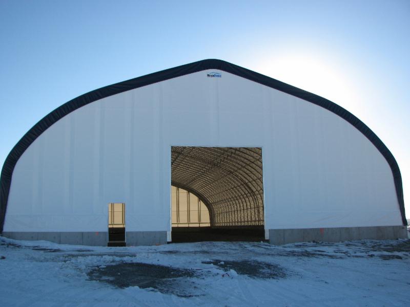 積雪タイプでは、通常のテント倉庫より鉄骨の構造を強くつくり、雪が屋根から落ちやすいように傾斜もつけています。